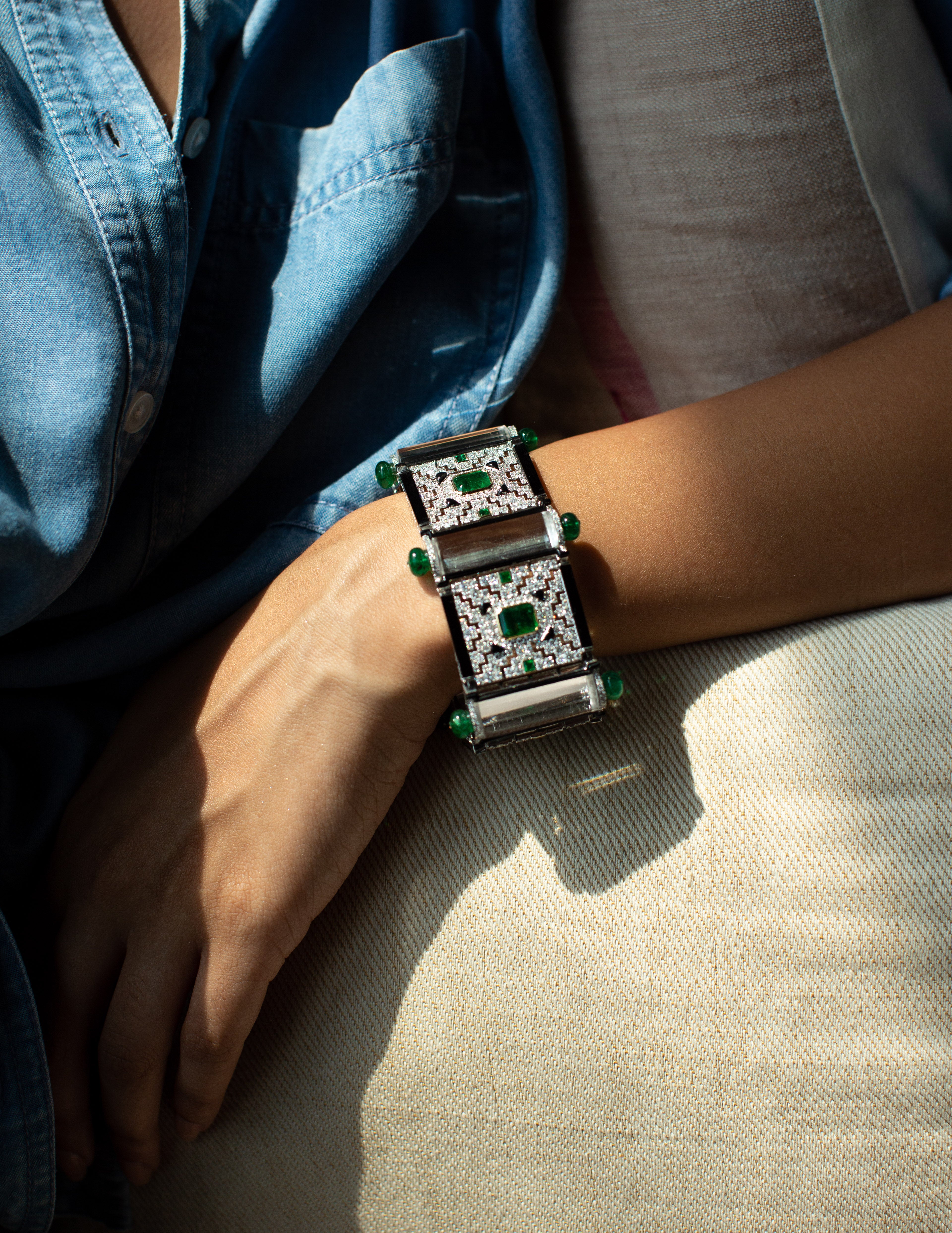 Cabochon emerald, white enamel, and 18K gold.