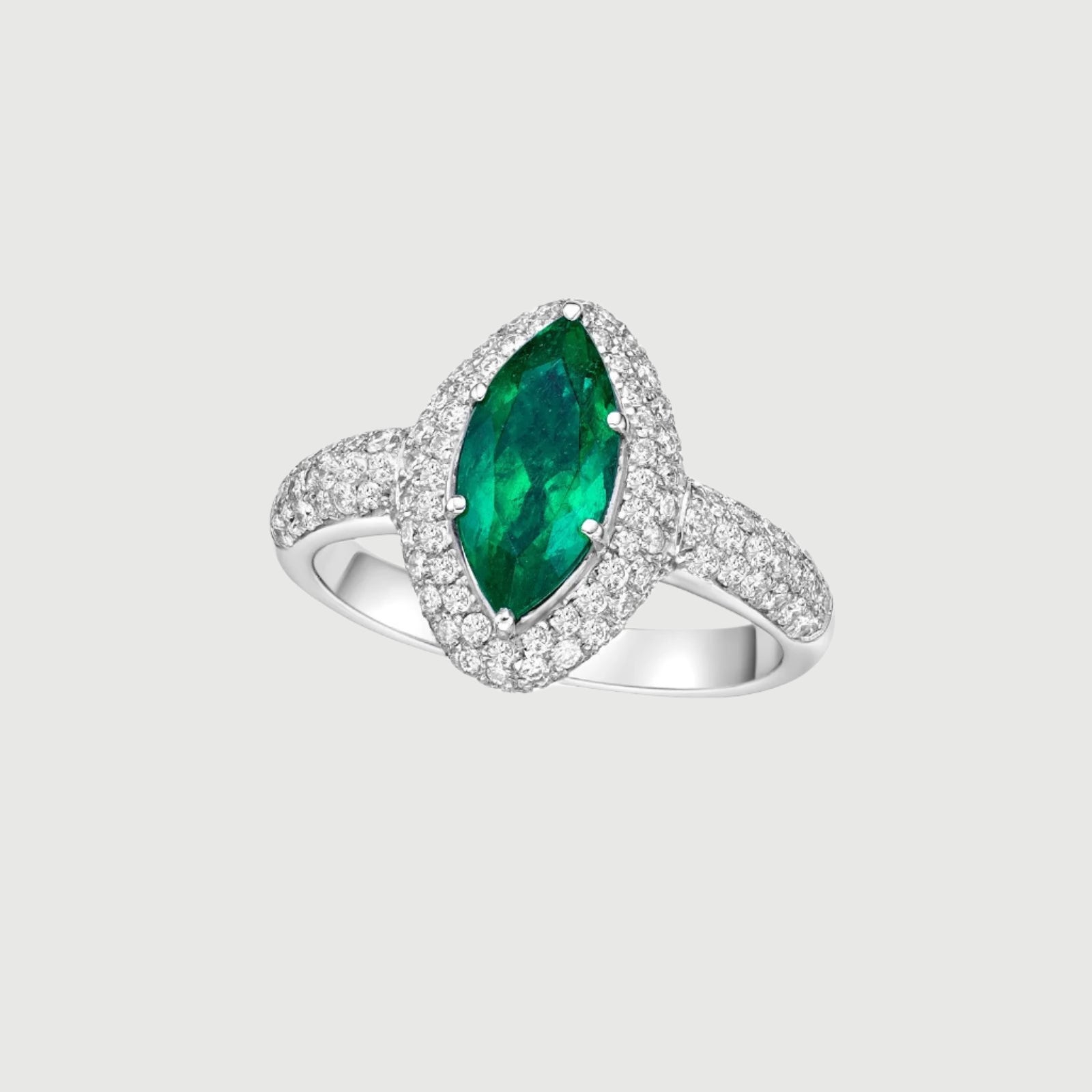 Ring with marquise cut Colombian VG emerald and diamonds in platinum